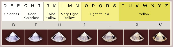 Color differences are measured by the internationally-accepted, industry standard, grading scale established by the Gemological Institute of America (GIA) grading scale. The highest grade for a diamond with absolutely no color is D and letter grades are assigned alphabetically all the way to Z. The farther away from the letter D a grade is, the more traces of yellow or brown it appears to have. Each letter grade has a clearly defined range of color appearance and each diamond is color-graded by comparing them to stones of known color under controlled lighting and precise viewing conditions.